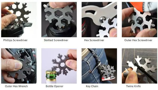 MULTIFLAKE-værktøjet kan bruges til at åbne ølflasker, skrue skruer, reparere snowboards, cykler, legetøj og meget mere.