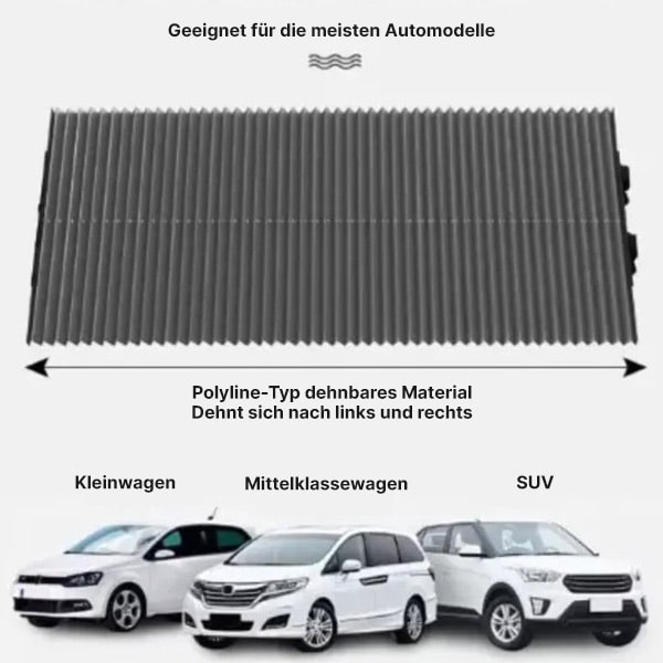Denne solskærm er designet til at passe til en bred vifte af køretøjer, herunder biler, varevogne, lastbiler og SUV’er. Den har en universel pasform, da du nemt kan tilpasse bredden til den ønskede størrelse.