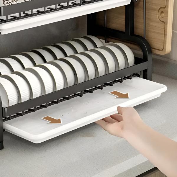 Det innovative fleretagers design gør det muligt at tørre tallerkener, glas, skåle, kogegrej og redskaber i én kompakt enhed.