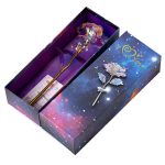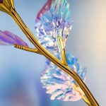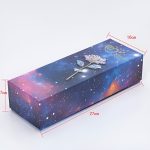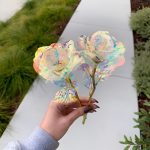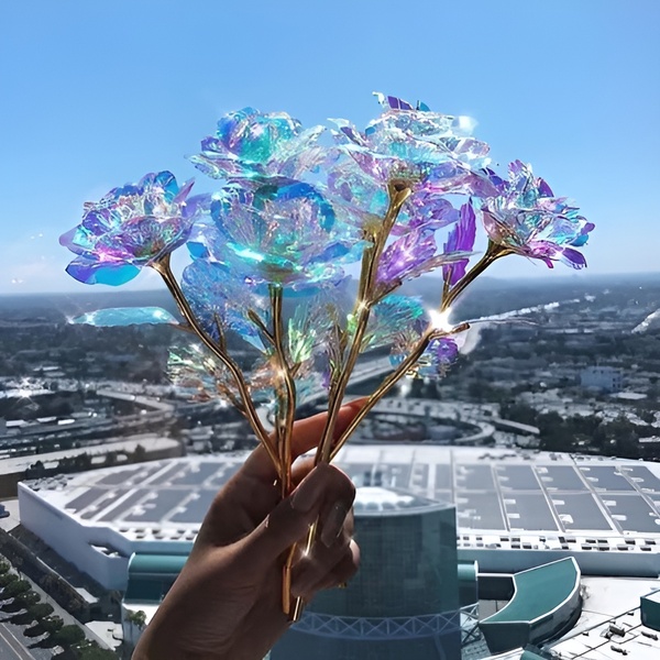 Hver rose er belagt med en iriserende, holografisk overflade, der glimter smukt i lyset og skaber et galakse-lignende skær, som er helt fortryllende.